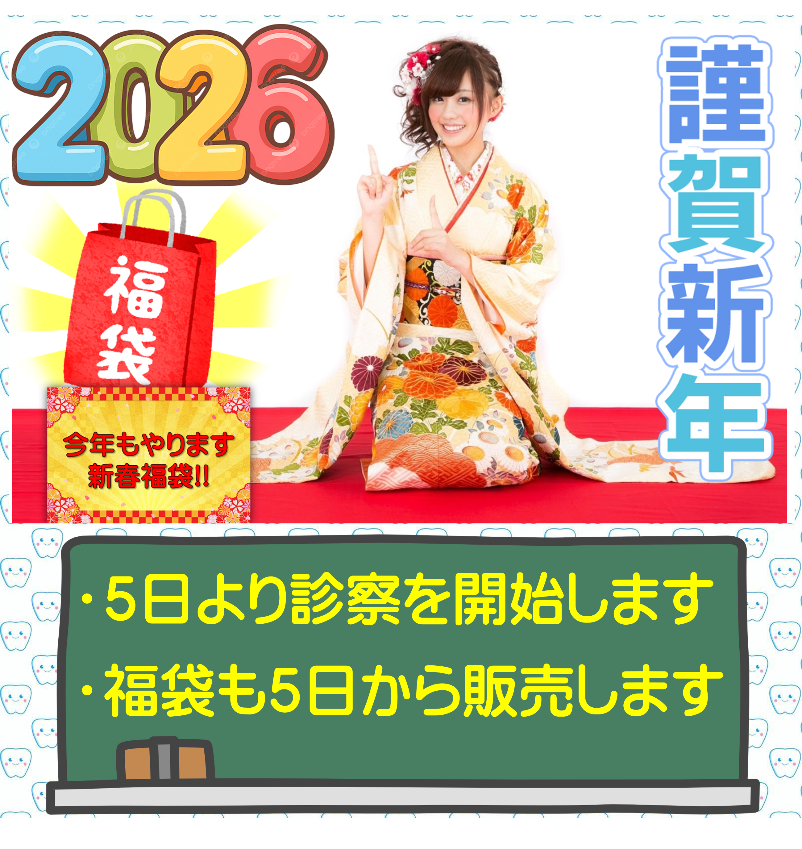 本年もよろしくお願いします 2026年も「こまざき矯正歯科クリニック」を宜しくお願いいたします。 本年も皆様の矯正歯科治療を適切にスタッフ一同全力でおこなっていきます。 新年は5日より診察開始いたします。 また、例年同様に「歯科福袋」を5日より販売開始します。 今年もお得満載の福袋になっております。 待合室に福袋コーナーがありますので是非お立ち寄りください。 ※数量限定の為、種類によっては早期に売り切れとなる場合がありますのでご了承ください ※購入に関して数量制限なし
